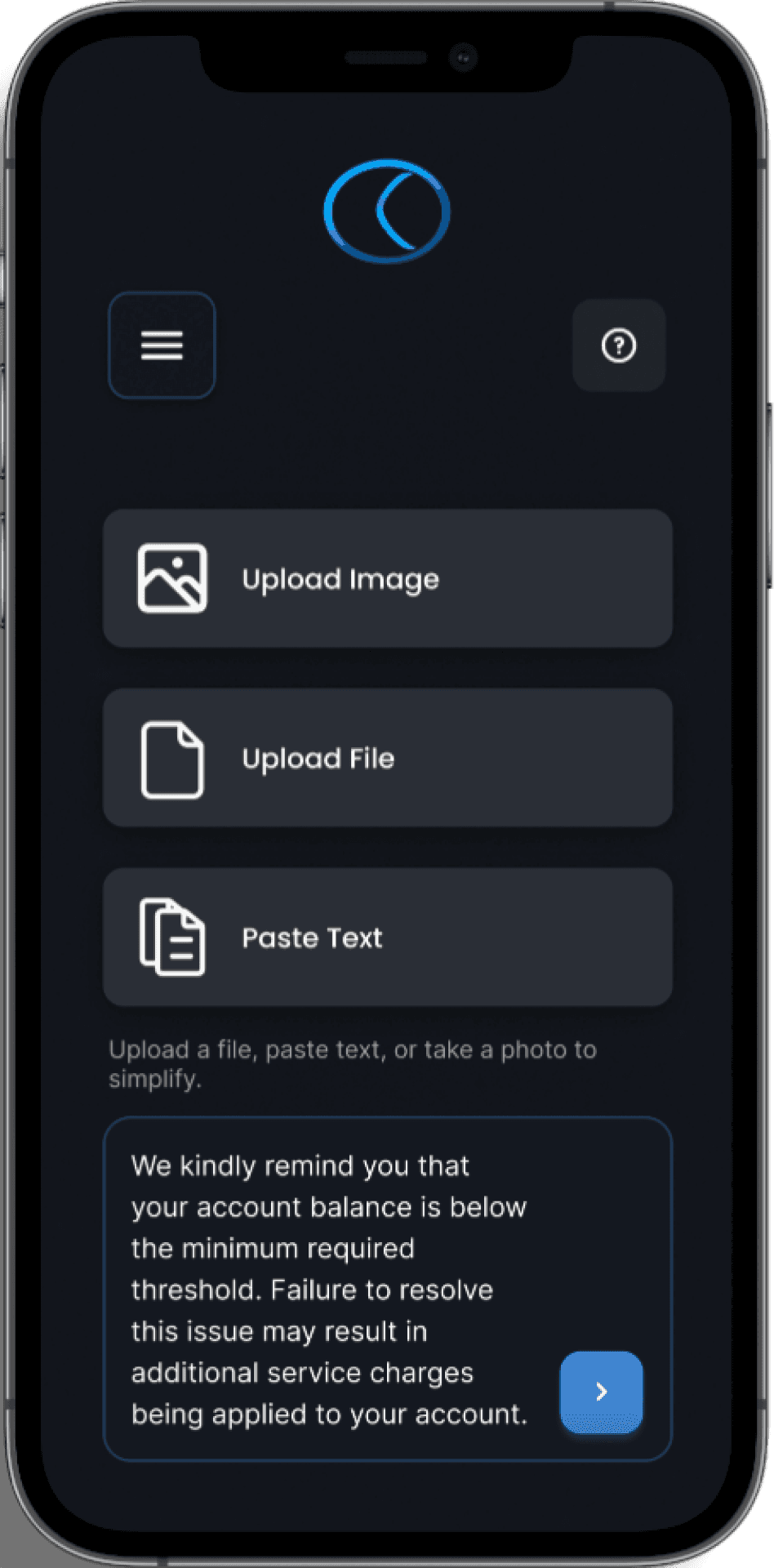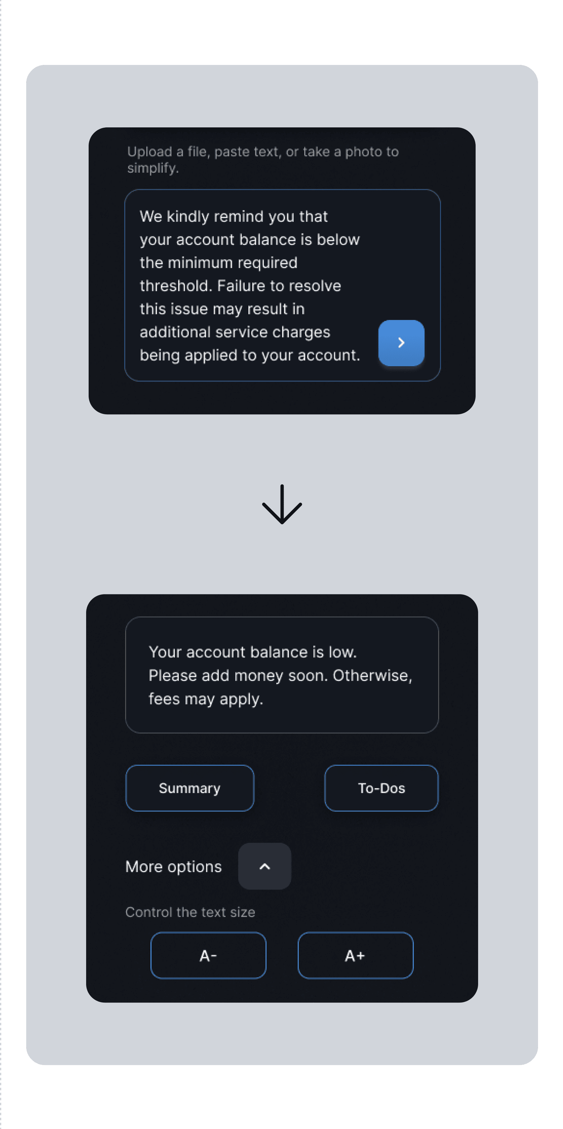 One-tap toggle between original and simplified text ensures clarity without adding friction.