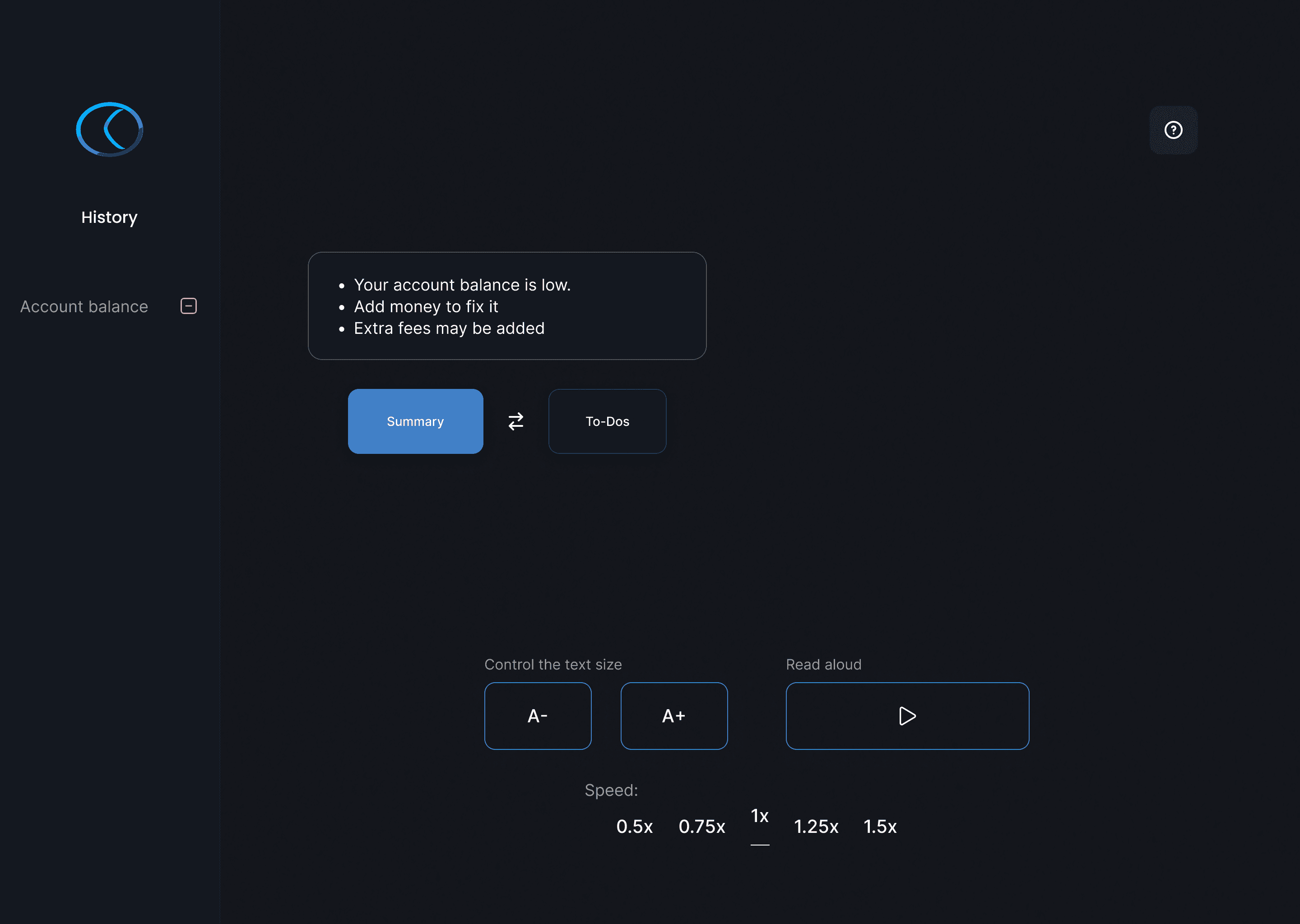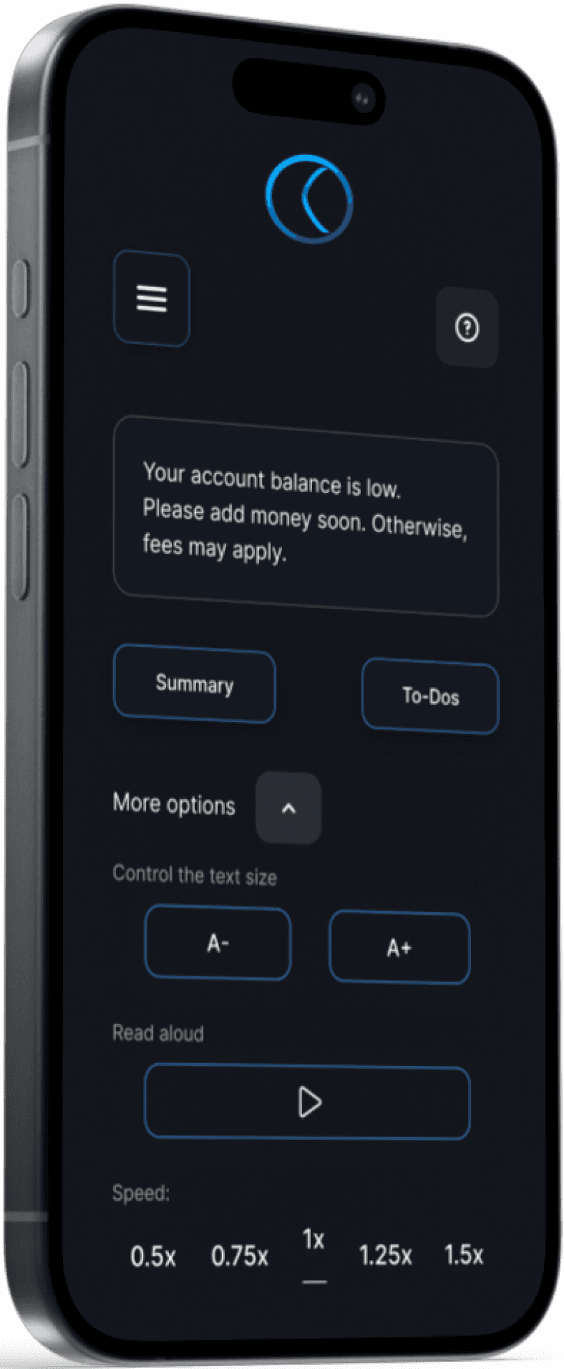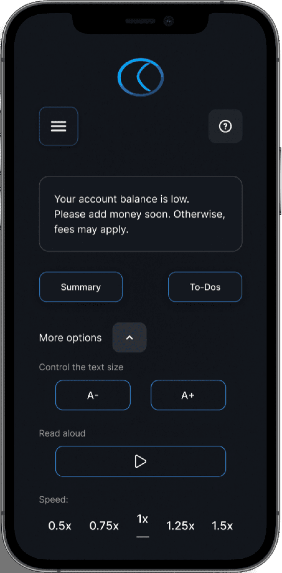 Simplified view with adjustable font size and one-tap text-to-speech.