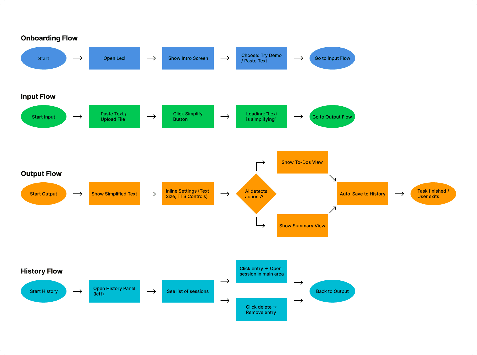 To address these challenges, I mapped out the key flows that guide users from uploading text to simplifying and listening to it.